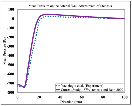 Mean pressure on the arterial wall in the post-stenotic region compared to [26].