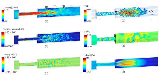 Instantaneous flow parameters: (a) axial velocity; (b) vorticity; (c) helicity; (d) the turbulent kinetic energy (TKE) on the isosurfaces of Q-criterion; (e) wall pressure fluctuations, and (f) root mean square (RMS) of the pressure fluctuations at the middle cross-section of the flow domain.