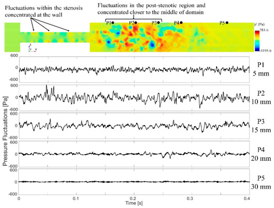 A cross-sectional view of the pressure fluctuations and time series data of the wall pressure fluctuations on the sample points at different locations downstream of the stenosis. Note that only a part of the flow domain close to the stenosis is shown in this figure.