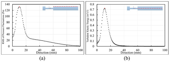 To localize sound sources, it is essential to find the point of maximum excitation in the post-stenotic region. Variation of the RMS of the pressure fluctuations along the wall and TKE along the centerline of the stenosis are shown in Figure 8. With the existence of flow recirculation, the RMS of pressure fluctuations started around 30 Pa at the exit of stenosis on the wall and increased to a maximum value of about 130 Pa at 11.5 mm downstream of the stenosis (or about x = 2D), as shown with the red dot, Figure 8a. This is within the region of interest with the maximum arterial wall fluctuations. Similar results were concluded in a previous experimental study [24]. After the peak value, as the energy of fluctuations dissipated, the RMS of the pressure fluctuations was down to around 20 Pa at about x = 40 mm, and it gradually decreased to zero along the wall.