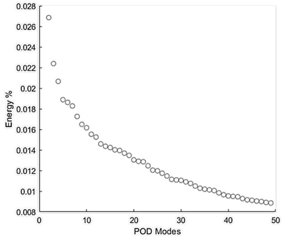 Figure 9 shows the energy distribution of the first 50 POD modes. POD Mode 0 is related to the mean flow with the highest energy, which was excluded from this figure. These results showed that POD mode 1 (i.e., the next most energetic mode) contained about 2.7% of the total energy of all the modes. Although an analysis of higher-order (i.e., low-energy) POD modes may unveil information on important flow fluctuations with specific higher frequencies related to the turbulence or geometry characteristics [43], the scope of this paper limits the focus to analyze coherent structures with the highest energy fluctuations (i.e., POD mode 1) that may help identify the region(s) with high-energy acoustic sources.