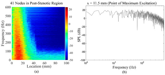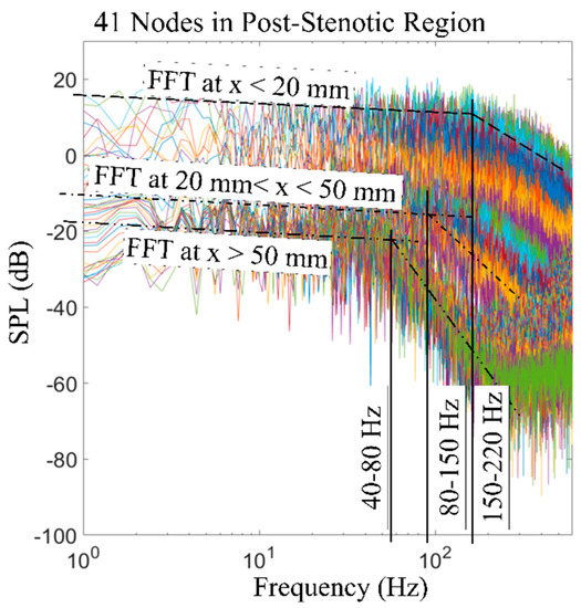 The extracted time series of the wall pressure (Figure 7) on 41 nodes along the post-stenotic vessel wall were recorded at a sampling frequency of 8 kHz. The data was then postprocessed using MATLAB to transform into the spectral domain by performing Hanning window filtering and fast Fourier-transform (FFT) and providing an acoustic spatial-frequency map of the post-stenotic region shown in Figure 11a. The acoustic pressure amplitudes (or sound pressure levels (SPLs)) were converted to a logarithmic scale using Equation (3):