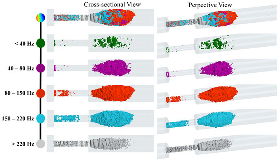 To visualize the spectral decomposed acoustic pressures, we applied temporal filtering to the pressure fluctuation, , for the last 0.2 s of data. Here, the time series of values at each mesh node was forward-backward-filtered through a bandpass sixth-order Butterworth filter with specified cutoff frequencies. These filters were designed using the MATLAB signal processing toolbox (2020b. The MathWorks, Inc., Natick, MA, USA). Acoustic pressures were visualized using isosurfaces of the RMS of filtered pressure fluctuation, , for different frequency ranges, as shown in Figure 13. Such a visualization can help the acoustic source localization of specific frequencies in the flow domain. These frequency ranges were selected such that the focus was given to the break frequencies of the spectra measured in the post-stenotic region at different points on the wall, as shown in Figure 12. These results indicated that all frequencies are mainly generated inside the stenosis and the post-stenotic region, up to x = 4D. Aligning with our flow analysis results shown in Figure 6 and Figure 7, which indicated the existence of turbulent fluctuations inside the stenosis and post stenotic regions, overall, it can be concluded that the turbulence generates broadband acoustic sources in these regions.