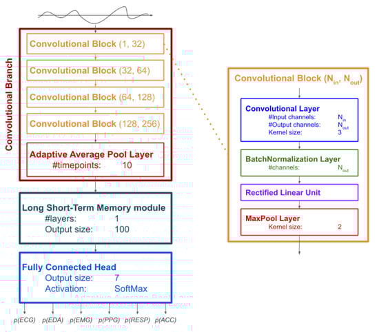 With a specific focus on multivariate physiological signals, the DNN approach adopted in this study can be easily adapted to simultaneously process multiple types of signals: convolutional branches can be used to extract a set of features from each type of signal that are then merged by the FCH [].