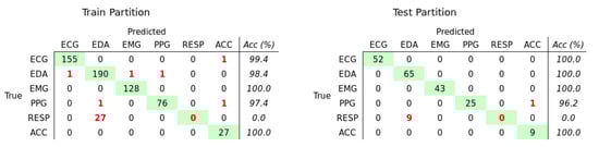 Overall, the reported performances were similar in both the train and test partitions, suggesting that the training process was able to efficiently detect and extract characterizing patterns and avoid over-fitting. However, we observed that the model was not able to correctly classify the RESP signals, which were confounded with EDA.