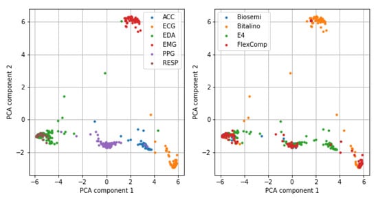 Representation of the input samples in the two-dimensional space defined by the Principal Component Analysis (PCA) of the extracted features. Left: colored by type of signal; Right: colored by type of device.