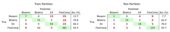 The device with the lowest class accuracy was the Biosemi ( on train, on test), while the most frequent classification error was attributing a signal to the FlexComp device. Again, the motivation can be found by observing the results of the PCA analysis (Figure 3): since the same device is used to collect multiple types of signals, the extracted features, which well separated the types of signals, are not as optimal to discriminate the devices.