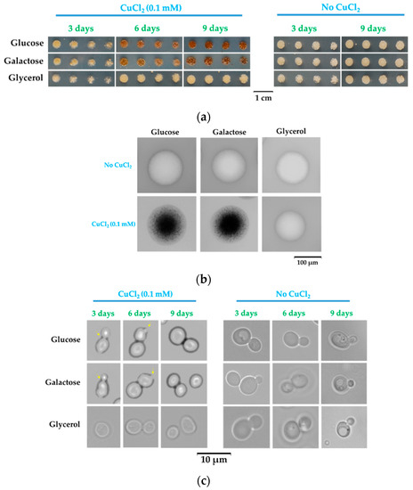 When changing glucose with galactose—another reducing sugar often used in experimental yeast media—the cells also changed color in time (Figure 1a, middle row). In contrast, when the carbon source was glycerol, the cells no longer changed color during copper exposure (Figure 1a, bottom row), suggesting that reducing sugars may play a role in cell coloration. Microscopically, the yeast cell populations grown on agar plates containing copper appeared with dark spots on their surface when grown on reducing sugars glucose and galactose; such spots were absent on cell populations grown on glycerol media (Figure 1b). Overall, the colonies obtained from single cells plated on MM/agar media appeared dark brown when copper exposure was done in the presence of glucose or galactose, being darker in the center, where the majority of cells accumulated (Figure 1b); in contrast, when copper exposure was done in the presence of glycerol, the colonies remained uncolored, as in the case of cells not exposed to copper (Figure 1b). Visually, single colonies increased in size up to day 3–4 from plating; afterward, the size of the colonies did not significantly change, but the color of colonies grown on glucose or galactose continued to amplify, becoming dark after 8–9 days of incubation (Figure 1b). When analyzing individual cells, it was noted that cells exposed to copper showed a dark halo when cells were grown on glucose or galactose, and this halo was absent (or very thin) on cells grown on glycerol (Figure 1c, left panel). After approximately 3 days, cells enter the stationary phase. Nevertheless, it was noticed that some cells exposed to copper still proliferated after 3–6 days of low copper exposure in the presence of glucose or galactose (Figure 1c, yellow arrow); this proliferation could no longer be seen after 9 days of exposure, indicating that the cells may have entered a dormant state [44].