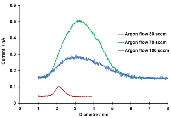 In addition to size pre-selection via MesoQ software, at fixed values of WD and temperature, size and size distribution of IONPs can be controlled changing the flow rate of the inert gas [42] in relation to the power and the throttle position (Table S3, Supplementary Information). To assess the effect of the inert gas (argon) flow rate at fixed WD and room temperature (20 °C), in this work, IONPs were generated using different flow rates and by applying enough power to achieve a stable plasma. The results depicted in Figure 2 show that IONPs production was not as high when slower argon flow rates were used (e.g., 30 sccm) and the production was at its maximum with the intermediate values of flow rate tested (70 sccm), when currents higher than 0.5 nA were recorded. The argon flow rate seems to affect not only the amount of particles generated, but also their size and distribution. In fact, at an argon flow rate of 30 sccm IONPs with size around 2 nm were produced, while flow rates of both 70 and 100 sccm produced particles with size between ~ 1–6 nm (Figure 2).