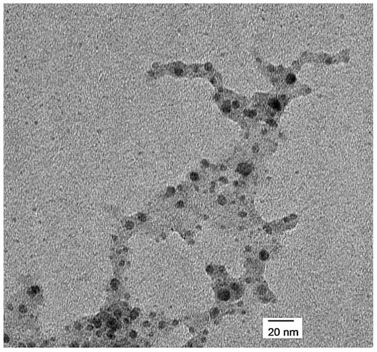 IONPs produced from Fe3O4 targets at room temperature (20 °C) on silicon wafers coated with PEG, with an argon flow rate of around 70 sccm, were dispersed in 15 mL RNAse free water as described in the Materials and Methods section. As the amount of PEG spin-coated on the silicon wafer was estimated to be around 15.8 mg, the final concentration in the RNAse free water was calculated as 1.05 mg/mL. RNAse free water was selected as medium as the nanoparticles produced here will be investigated in the near future for delivery of gene therapy using RNA. A droplet (20 µL) of the IONPs suspension was then placed on an in-house, circular TEM grid (3 mm Ø), air dried and analyzed by TEM. The sample showed spherical IONPs (or aggregates) smaller than 20 nm, within a dry PEG matrix (Figure 3).