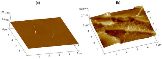Comparison of the bare and coated substrates show topographical variation. The AFM images show an increased roughness due to the presence of the PEG layer (Figure 4b). The brighter spots on Figure 4b, might indicate presence of the IONPs within the PEG layer, confirming what was already seen in the TEM images.