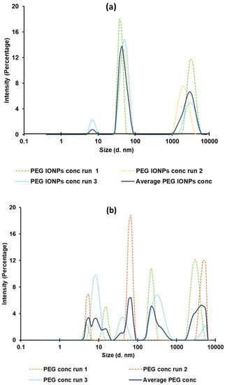 In order to estimate the size and size distribution of the PEG-coated IONPs, the nanoparticles solution was concentrated 3 times and measured by DLS (Figure 5a). A solution containing only PEG, prepared as explained in the Methods section, was also concentrated 3 times and measured as control (Figure 5b) giving a final concentration of PEG in both solutions of around 3 mg/mL.