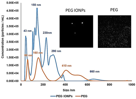 In order to obtain further confirmation of the results observed by DLS, NanoSight Nanoparticles Tracking Analysis (NTA) of the two solutions (PEG IONPS and PEG only concentrated 3 times) was also performed. The NTA results are shown in Figure 6.