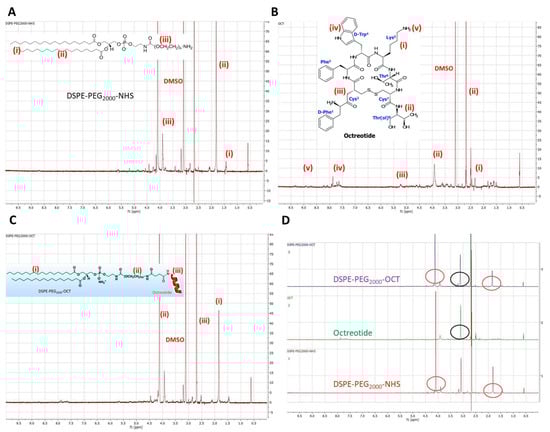 1H NMR spectrum of (A) DSPE-PEG2000-NHS, (B) OCT, (C) DSPE-PEG2000-OCT and (D) stacked spectrum of DSPE-PEG2000-OCT, OCT and DSPE-PEG2000-NHS.