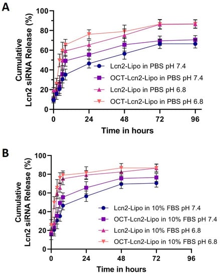 Dissolution of Lcn2 siRNA OCT-Lcn2-Lipo and Lcn2-Lipo liposomal formulations. (A) Cumulative release of Lcn2 siRNA from OCT-Lcn2-Lipo and Lcn2-Lipo in 1× PBS at pH 7.4 and pH 6.8. (B) Cumulative release of Lcn2 siRNA from OCT-Lcn2-Lipo and Lcn2-Lipo in 10% Fetal Bovine serum in 1× PBS at pH 7.4 and pH 6.8. The data were expressed as mean ± SD (n = 3).