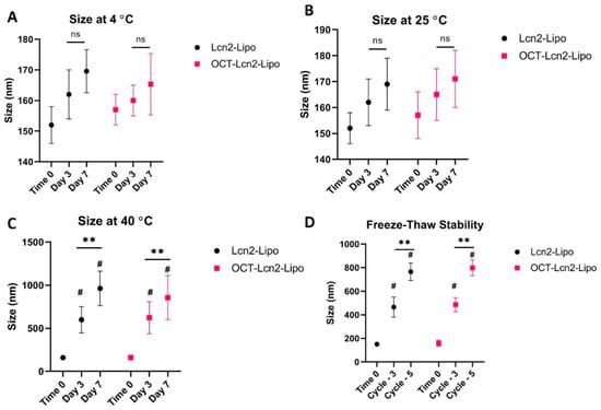 Temperature and freeze-thaw stability study for OCT-Lcn2-Lipo. (A) Temperature stability study for OCT-Lcn2-Lipo and Lcn2-Lipo at 4 °C, (B) Temperature stability study for OCT-Lcn2-Lipo and Lcn2-Lipo at 25 °C, (C) Temperature stability study for OCT-Lcn2-Lipo and Lcn2-Lipo at 40 °C, (D) Freeze-thaw stability study for OCT-Lcn2-Lipo and Lcn2-Lipo. The data were expressed as mean ± SD (n = 3). (# p ≤ 0.05 as compared to Time 0, ns = non-significant, ** p ≤ 0.01 as compared to Lcn2-Lipo group).