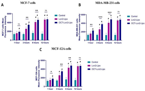Time-dependent uptake of OCT-Lcn2-Lipo and Lcn2-Lipo prepared with the addition of FITC conjugated siRNA. (A) Uptake of OCT-Lcn2-Lipo and Lcn2-Lipo solution in MCF-7 cells, (B) Uptake of OCT-Lcn2-Lipo and Lcn2-Lipo solution in MDA-MB-231 cells. (C) Uptake of OCT-Lcn2-Lipo and Lcn2-Lipo solution in MCF-12A cells. The data were expressed as mean ± SD (n = 3). (# p ≤ 0.05 as compared to control group, ** p ≤ 0.01 and *** p ≤ 0.001 as compared to Lcn2-Lipo group).