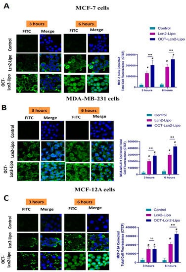 Time-dependent uptake of OCT-Lcn2-Lipo and Lcn2-Lipo prepared with addition of FITC conjugated siRNA. (A) Intracellular distribution and corrected total cell fluorescence (CTCF) of OCT-Lcn2-Lipo and Lcn2-Lipo formulation in MCF-7 cells, (B) Intracellular distribution and CTCF OCT-Lcn2-Lipo and Lcn2-Lipo solution in MDA-MB-231 cells. (C) Intracellular distribution and CTCF OCT-Lcn2-Lipo and Lcn2-Lipo solution in cells.MCF-12A cells. The data were expressed as mean ± SD (n = 3). (# p ≤ 0.05 as compared to control group, ** p ≤ 0.01 and *** p ≤ 0.001 as compared to Lcn2-Lipo group).