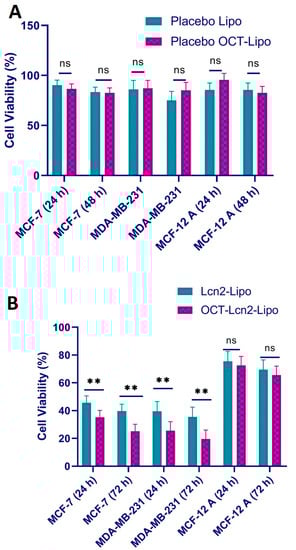 Cell viability for placebo (A) OCT-Lipo and (B) OCT-Lcn2-Lipo in breast cancer cell lines MCF-7, MDA-MB-231, and normal breast epithelium cells MCF-12A for 24 and 72 h. The data were expressed as mean ± SD (n = 3) (** p ≤ 0.01 and ns = not significant).