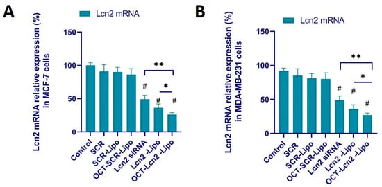 Lcn2 siRNA knockdown of Lcn2 gene expression at the mRNA level in MCF-7 and MDA-MB-231 cells using real time RT-PCR. (A) Lcn2 mRNA relative expression in MCF-7 cells after treatment with OCT-Lcn2-Lipo. (B) Lcn2 mRNA relative expression in MDA-MB-231 cells after treatment with OCT-Lcn2-Lipo. The data were expressed as mean ± SD (n = 3). (# p ≤ 0.05 as compared to control group, * p ≤ 0.05, ** p ≤ 0.01 and as compared to Lcn2 siRNA group).