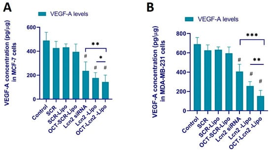 Vascular endothelial growth factor -A (VEGF-A) quantification in conditioned media (CM) from MCF-7 and MDA-MB-231 cells treated with OCT-Lcn2-Lipo using ELISA. (A) VEGF-A concentration (VEGF/total protein, pg/μg) in CM from MCF-7 cells treated with OCT-Lcn2-Lipo using ELISA. (B) VEGF-A concentration (VEGF/total protein, pg/μg) in CM from MDA-MB-231 cells treated with OCT-Lcn2-Lipo using ELISA. The data were expressed as mean ± SD (n = 3). (# p ≤ 0.05 as compared to control group, * p ≤ 0.05, ** p ≤ 0.01 and *** p ≤ 0.001 as compared to Lcn2 siRNA group).