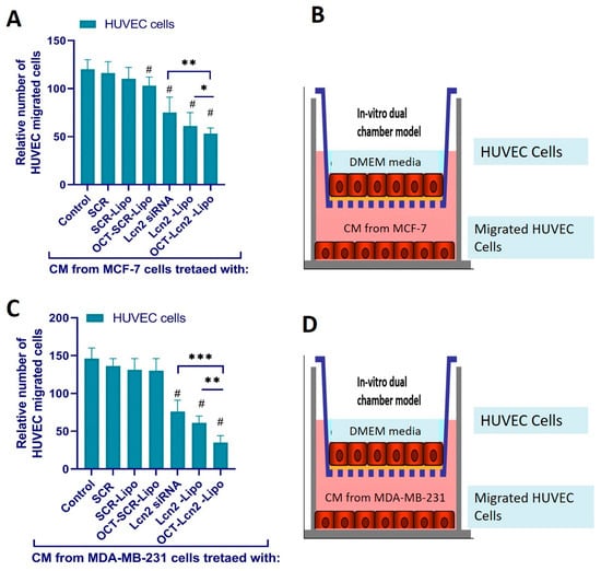 Human Umbilical Vein Endothelial Cells (HUVEC) migration toward conditioned media (CM) harvested from MCF-7 and MDA-MB-231 cells treated with OCT-Lcn2-Lipo. (A) Relative number of HUVEC cells migrated towards CM Figure 7. cells in a trans-well filter assembly. (B) Pictorial representation of Trans-well dual chamber filter assembly where HUVEC cells are in the upper chamber and CM from MCF-7 cells is in the bottom chamber. (C) Relative number of HUVEC cells migrated towards CM from MDA-MB-231 cells in a trans-well filter assembly. (D) Pictorial representation of Trans-well dual chamber filter assembly where HUVEC cells are in the upper chamber and CM from MDA-MB-231 cells is in the bottom chamber. The data were expressed as mean ± SD (n = 3). (# p ≤ 0.05 as compared to control group, * p ≤ 0.05, ** p ≤ 0.01 and *** p ≤ 0.001 as compared to Lcn2 siRNA group).