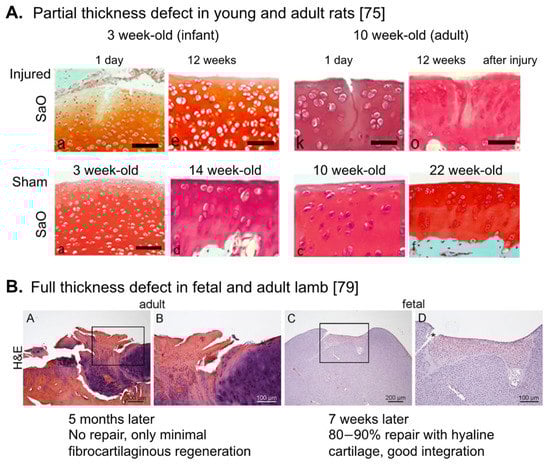 Another strategy to improve the outcome of cell-based cartilage repair is to take the age of reparative cells into account. In contrast to adult joint cartilage, embryonic/fetal joint cartilage possesses spontaneous scar-less repair activity for a chondral (partial-thickness) defect []. In small animals, such activity continues to the postnatal infant stage. For example, 3 week-old infant rats [,,], and 12–14 week-old young rabbits [,,] spontaneously repair partial-thickness defects of joint articular cartilage, but these activities disappear in the adulthood. Full-thickness and osteochondral defects show some spontaneous repair activity even in adult animals, but repair tissues are normally fibrotic, similar to the repair outcome of the microfracture method [,]. However, still the younger the better, since full-thickness and osteochondral defects in fetal [] (Figure 1B) and adolescent animals (e.g., 6 week-old rats and 13–15 week-old rabbits) [,,,,], show faster and hyaline cartilage repair, dependent on the size of injury.
