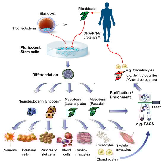 In early studies, biological methods: e.g., selective expansion culture, were mainly employed for enriching or purifying chondrogenic mesenchymal cells or MSCs []. PSCs were differentiated by way of forming embryoid bodies (EB) in vitro. Then, mesenchymal cells growing out of EBs, called EB outgrowth cells, were selectively expanded in media similar to those developed for expanding bone marrow MSCs, prior to induction of chondrogenesis and use for cartilage repair analyses [].