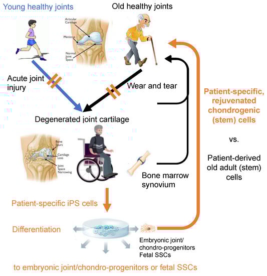One of the major advantages of the iPSC technology on clinical application is to be able to get patient specific, “rejuvenated” cells [,,,] (Figure 3). Currently, it requires technically demanding two-step processes: i.e., gene/RNA/protein transfer or small molecule treatment to effectively reprogram adult cells to PSCs, followed by directed differentiation of the obtained PSCs to the cell-type of interest. In contrast, the “direct reprogramming” technology depends on one step process: i.e., gene/RNA/protein transfer, and is capable of inducing somatic cells, such as fibroblasts, to transdifferentiate to another type of somatic cells, such as neurons [], osteoblasts [], and chondrocytes [], without going through the PSC stage. Therefore, this method will also eliminate the concern of contamination of teratoma-forming activity. However, such direct reprogramming technology seems to transfer the same problems or risks associated with the age of original somatic cells over to the reprogrammed cells [,]. The aging of adult stem cells has been noted, and attributed to the diminished regenerative activity in aged adult tissues [,,]. Therefore, whenever rejuvenated stem cells are expected to show improved clinical outcome from a cell-based regenerative therapy, patient-specific hPSC-derived cells are likely suitable over cells isolated from patients or those directly reprogrammed. In this respect, while adult MSC-based therapies for injured or degenerated articular cartilage are currently being trialed [,], it would be of great interest in examining whether patient-specific hiPSC-derived embryonic MSCs and SSCs, or chondroprogenitors will result in better repair outcome than adult MSCs.