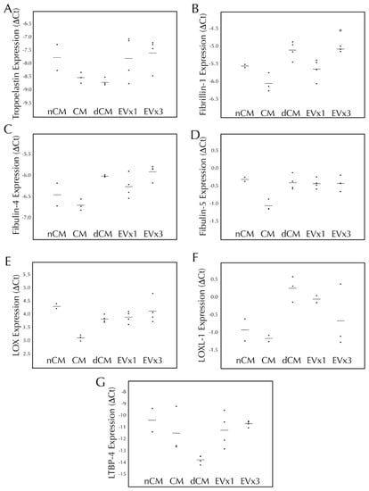 3.4. ASC-Derived EVs Had a Minimal Effect on Elastic Fiber Gene Transcription within SMC Disc Constructs after 30 Days of Culture