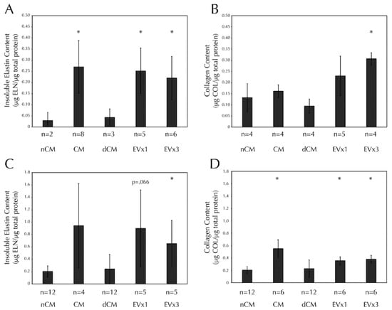 3.6. ASC-Derived EVs Promote Insoluble Elastin and Collagen Deposition within SMC Strand Constructs after 30 Days of Culture