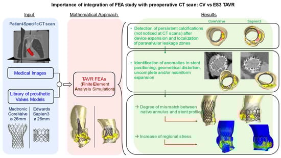 Finite element analysis (FEA) was shown to provide a more accurate evaluation of several morphological and hemodynamical parameters in the aortic root [13,14,15]. The integration of FEA with the routinely used CT scan could therefore constitute a fruitful approach to investigate factors implied in the development of device complications and to predict their occurrence on the basis of patient-specific imaging. We therefore use post-processing FEA to investigate cases of failed self-expandable and balloon-expandable transcatheter heart valves, with the aim to identify elements or abnormalities potentially responsible for valve failure and to generate potential models to predict the occurrence of complications (Figure 1).