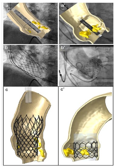 FEA simulations of TAVR in two investigated patients who showed postoperative thrombosis. The positioning (a,a′) and reopening (c,c′) of CoreValve and Sapien devices (left and right sides, respectively), compared to the corresponding intraoperative angiographic images (b,b′).