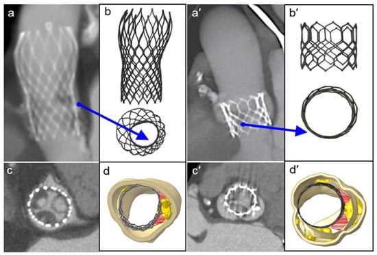 Postoperative medical images (a,c,a′,c′) compared to the FEA results of the TAVR simulations (b,d,b′,d′, front and top view, respectively) of the CoreValve and Sapien devices. The red areas show paravalvular orifices due to the presence of residual calcifications, and the blue arrows indicate the major distortion of the frames and their incomplete and/or asymmetric expansion.