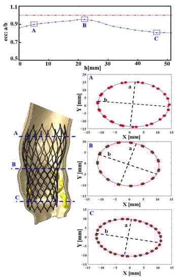In the re-hospitalized patient: CoreValve deformation measured through its postimplant eccentricity, computed as a/b, i.e., (minimum radius)/(maximum radius) of 22 equally spaced cross-sections of the frame. In the first chart from above, the blue line describes the real prosthesis deformation, plotted against its longitudinal height (h, growing towards the inferior base of the device), compared to the red one, which represents the perfect circularity (ideal eccentricity ecc: a/b = 1). Three cross-sections (A–C) are highlighted. As expected, the most elliptically deformed device portion is the distal one (C), at the level of the greatest uncrushed calcifications, (mm: millimeter values).