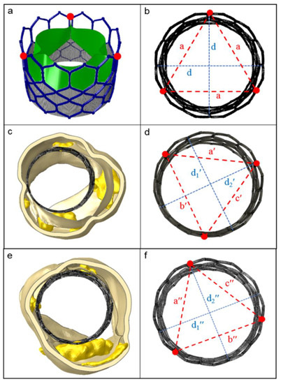 The ideal shape of a Sapien 3 stent frame (upper panels) compared to the real ones after implantation in patients under study. (a) Open device configuration before crimping; (b) perfect frame circularity, when the two principal axes d have the same length, such as the triangle edges a (top view); (c,e) balloon-driven device re-expansion within the investigated patients (thrombotic and control case, respectively); (d,f) evaluation of the implanted stent deformation, proposed as the measure of the three distances between the points at the commissure windows (red dots). [a′ ≠ b′ ≠ c′ ≠ a; a″ ≠ b″ ≠ c″ ≠ a; d1′ and d2′, d1″ and d2″: minor and major axes of the originated ellipses; d1′ ≠ d2′ ≠ d; d1″ ≠ d2″ ≠ d].