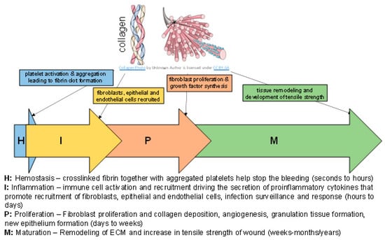 Sophisticated regulation by a number of key factors including the environment of the wound which is rich in extracellular matrix (ECM) drives the process of wound healing [1,2]. The complex macromolecules constituting the ECM include fibrous components (e.g., collagens and elastins) and glycoprotein components (e.g., fibronectin, proteoglycans and laminins). Each of these molecules interact to drive the process of tissue function, growth and repair [3,4,5]. Wound repair is a complex process that is broadly categorized into the following four phases which occur in a temporal sequence but are overlapping: hemostasis, inflammation, proliferation (cellular infiltration, angiogenesis and re-epithelialization) and maturation/remodeling (Figure 1) [1]. Key steps of the wound healing process, such as hemostasis, inflammation and angiogenesis are responsive to the ECM, collagen and its compounds [1,6,7,8,9,10,11,12,13]. In response to injury, collagen induces platelet activation and aggregation resulting in the deposition of a fibrin clot at the injury site. In the inflammatory stage of wound healing, immune cell activation drives the secretion of proinflammatory cytokines which influence migration of fibroblasts, epithelial and endothelial cells. Fibroblasts contribute to collagen deposition. Simultaneously, collagen degradation releases fragments that promote fibroblast proliferation and synthesis of growth factors that lead to angiogenesis and re-epithelialization. Finally, the remodeling of the ECM (balance of new matrix synthesis and matrix metalloproteinase degradative activities) determines the acquisition of tensile strength [14,15,16]. In this work we sought to briefly review the significance of collagen in different biological processes relevant to wound healing. The current literature on the use of collagen-based products in wound care is summarized.