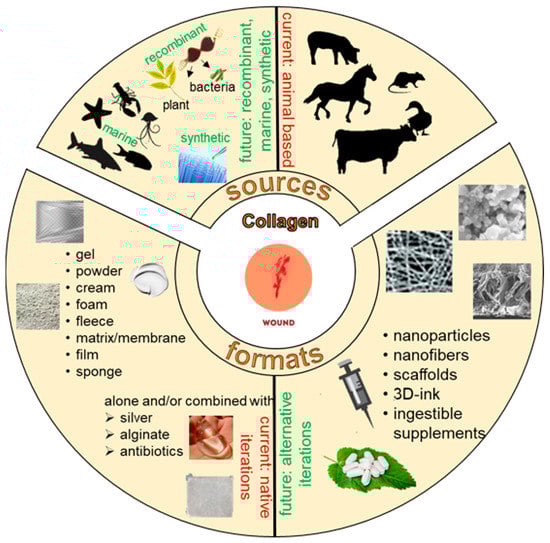 The technological processing of collagen tissues to hydrolysates and subsequent rebuilding into formats used for clinical applications was recently reviewed [98]. Several publications show the potential for collagen as a flexible biomaterial for wound healing. However, there is still a need for high-quality studies and randomized control trials to support their clinical applications [46,75].