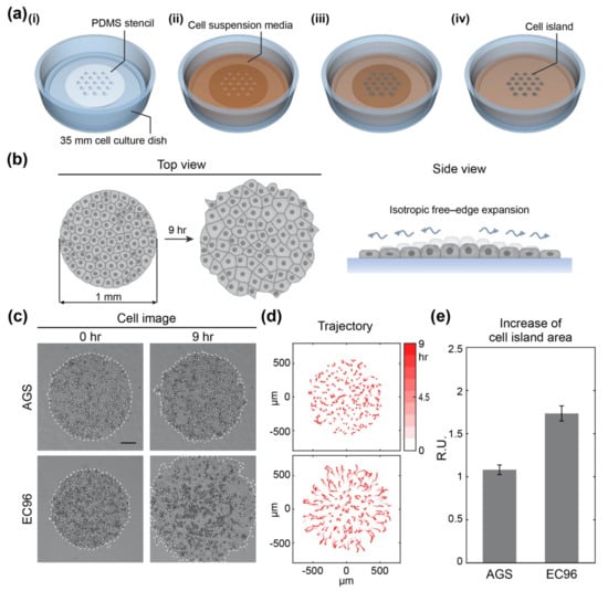 Experimental set-up of the isotropic free-edge expansion model and expansion of AGS and EC96 cell islands. (a) Schematic of circular-shaped cell island patterning for the isotropic free-edge expansion model; (i) placing a PDMS stencil in a 35 mm cell culture dish; (ii) adding cell suspension media over the stencil in the dish; (iii) incubating the dish for the cells to settle down within the holes of the stencil; (iv) removing the stencil to release the cell island to begin the expansion assay. (b) Schematic of the experimental model for isotropic free-edge expansion. (c) Bright-field images of AGS and EC96 cell islands at 0 h and 9 h after release (scale bar = 200 μm). (d) The trajectory of the cells within the AGS and EC96 cell islands. The stronger red color of the arrows indicates more time passed. (e) Relative increase rate of the AGS and EC96 cell islands. The error bars represent the standard errors calculated from separate assays on each group (n = 5).