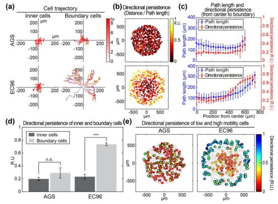 Comparison of motility and directionality of AGS and EC96 cell islands. (a) The trajectory from the initial locations of the inner and boundary cells within the AGS and EC96 cell islands. The stronger red color of the dots indicates more time passed. (b) Color-code map of the directional persistence of the cells within the AGS and EC96 cell islands. The brighter dots indicate higher directional persistence. (c) Average path length and directional persistence along with the same distance from center to edge of the AGS and EC96 cell islands. The error bars represent the standard deviations calculated from separate assays on each group (n = 5). (d) Average directional persistence of inner and boundary cells within the AGS and EC96 cell islands. The error bars represent the standard errors calculated from separate assays on each group (n.s. not significant and *** p < 0.001; n = 5). (e) Color-code map of the directional persistence of the lowest 25% (gray edge circles) and the highest 25% (black edge circles) of motile cells within the AGS and EC96 cell islands. Gray circles represent mid-quartile (25–75%) motile cells within each group population.