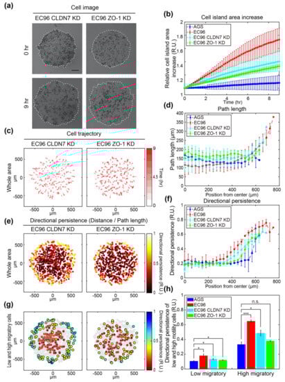 Analysis of motility and directionality of cell islands composed of tight junction protein knockdown cell lines and comparison with AGS and EC96. (a) Bright-field images of CLDN7 and ZO-1 KD cell islands at 0 h and 9 h after release (scale bar = 200 μm). (b) Relative area increase of cell islands composed of the AGS (blue circle), EC96 (red square), CLDN7 KD (cyan triangle), and ZO-1 KD (green diamond) cells over time. The error bars represent the standard deviations calculated from separate assays on each group (n = 5). (c) The trajectory of the cells within the CLDN7 KD and ZO-1 KD cell islands. The stronger red color of the arrows indicates more time passed. (d) Average path length along the same distance from center to edge of the AGS (blue circle), EC96 (red square), CLDN7 KD (cyan triangle), and ZO-1 KD (green diamond) cell islands. The error bars represent the standard deviations calculated from separate assays on each group (n = 5). (e) Color-code map of the directional persistence of the cells within the CLDN7 KD and ZO-1 KD cell islands. The brighter dots indicate higher directional persistence. (f) Average directional persistence along the same distance from center to edge of the AGS (blue circle), EC96 (red square), CLDN7 KD (cyan triangle), and ZO-1 KD (green diamond) cell islands. The error bars represent the standard deviations calculated from separate assays on each group (n = 5). (g) Color-code map of the directional persistence of the low 25% (gray edge circles) and high 25% (black edge circles) of motile cells within the CLDN7 KD and ZO-1 KD cell islands. Gray circles represent mid-quartile (25–75%) motile cells within each group population. (h) Average directional persistence of low and high motility cells within the AGS (blue), EC96 (red), CLDN7 KD (cyan), and ZO-1 KD (green) cell islands. The error bars represent the standard errors calculated from separate assays on each group (n.s. not significant, * p < 0.05 and *** p < 0.001; n = 5).