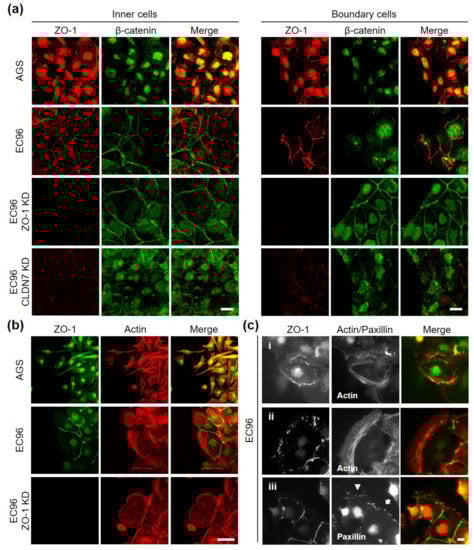 To investigate the underlying mechanism, an immunofluorescence assay was conducted (Figure 5). We analyzed β-catenin instead of E-cadherin because β-catenin also reflected E-cadherin-mediated AJ structure but showed more informative and clear images than E-cadherin labeling in our system. In AGS cells, most β-catenin was expressed in the nucleus and was difficult to observe in the cell membrane, while a small fragmented linear pattern of ZO-1 labeling was observed in cells regardless of whether they were inner or boundary cells (Figure 5a). In EC96 cells, β-catenin and ZO-1 were clearly located in the cell membrane, appearing like a net in inner cells. However, in boundary EC96 cells, membrane β-catenin appeared to be decreased and some nuclear expression was observed, while ZO-1 was still expressed in the membrane. In the case of ZO-1 KD cells, β-catenin labeling in boundary cells appeared like a net, similar to inner cells. Expression of E-cadherin was not affected by ZO-1 knockdown (Figure 3e), and β-catenin functions appeared to be enhanced in the absence of ZO-1.