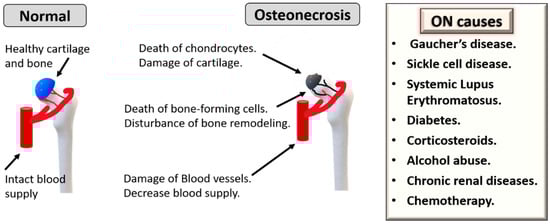 Osteonecrosis (ON), also named avascular necrosis, is a multifactorial and painful bone disease characterized by vascular insufficiency, progressive collapse of subchondral bone and cartilage damage. This disease often develops in the femoral head, but it could also affect other joints, mostly in young or middle-aged individuals. One main mechanism of ON pathogenesis is vascular damage due to clotting, embolism, increased intraosseous pressure and direct blood vessel injury []. ON can also be caused by direct trauma or infections. The most common non-traumatic conditions that can trigger ON are corticosteroids, alcohol abuse, Gaucher’s disease, sickle cell disease, Systemic Lupus Erythematosus, diabetes, chronic renal diseases and chemotherapy (Figure 1) []. Over the last three decades, autologous MSCs have attracted considerable interest as cellular regenerative therapies for ON []. For enhancing therapeutic outcomes, it is also important to consider the effects of patients’ age as ON is common among young and old populations but can occur in elderly individuals according to the underlying conditions [,,]. Here, we review how these predisposing causes of ON and age can affect the biological characteristics of MSCs.