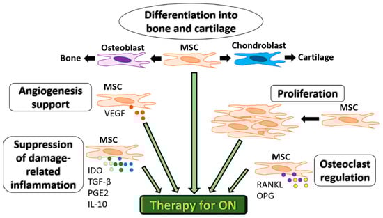 Extensive experimental research (in vitro and in vivo studies) has confirmed the unique and multifaceted regenerative capacities of MSCs. Because of their unique biological properties, MSCs represent a promising therapeutic tool for ON (Figure 2). Importantly, MSCs provide angiogenic support function mostly due to the production of Vascular endothelial growth factor (VEGF) and control osteoclastogenesis via the release of soluble factors such as RANKL and OPG [,]. These cells also have essential differentiation capacities needed to repair damaged bone and cartilage tissues in ON []. More recently, their high proliferation and ability of suppression of immune response associated with tissue damage via the production of immunosuppressive factors, indoleamine 2,3 dioxygenase (IDO), Transforming growth factor-beta (TGF-β), prostaglandin E2 (PGE-2) and IL-10 have been considered equally important [,,]. A controlled inflammatory reaction is required for the normal bone healing process and is deemed necessary for timely fracture repair and tissue regeneration in ON [].