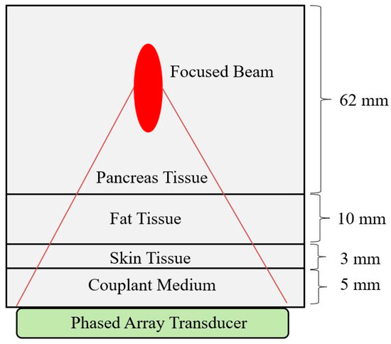 A large volume of data is needed for training machine learning algorithms. Since it is not practical for us to use a very large number of transducers and produce focused ultrasound responses for different array distributions on the transducer surface, we generated data with the modified angular spectrum method that is developed and verified in this study (Section 2.1) as a substitution for real data. We have created a dataset by considering a common soft tissue necrosis scenario where the focused beam from a phased array transducer travels through layers of tissues before converging in the target media. The tissue layout shown in Figure 1 represents how the tissue layers are arranged through couplant media, skin, fat, and finally pancreas tissue. These tissue properties are given in Table A3.