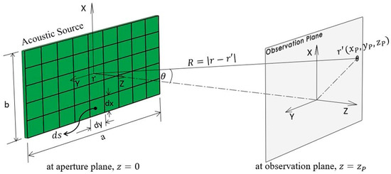 Here, is the distance between the source point and the observation point , is the wave number, ω is the excitation frequency, ρ is the medium density, and is the normal particle velocity. The time-harmonic excitation is defined as where , and is the time. Figure 2 shows the rectangular transducer geometry and corresponding coordinate system.