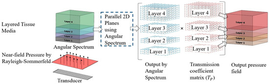 Here, and are incident and refraction angles, and are acoustic impedances in first and second media, respectively. The resultant pressure-field is calculated by multiplying angular spectrum pressure field with the 3D transmission coefficient matrix (). After this operation, the updated simulation grid volumes for each tissue layer represent the resultant continuous-wave pressure field response, and a 2D slice (horizontal or vertical) of this field can be used to visualize the pressure field. Figure 3 represents a schematic of the 3D continuous-wave pressure field calculation procedure in layered tissue media using the modified angular spectrum method.