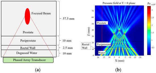(a) Schematic of tissue layers for modified angular spectrum. (b) Pressure field simulation by focusing the beam at 40 mm depth, and 5, 0, and −5 mm azimuth inside prostate tissue with 990 × 1 phased array sonication.