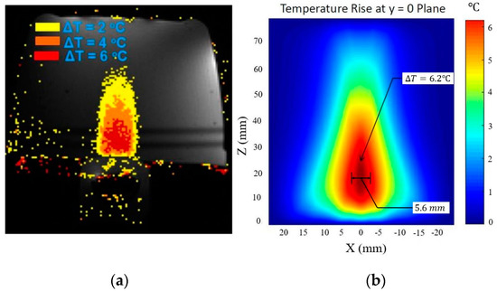 (a) Experimental observation of temperature rise in tissue-mimicking phantoms using Exablate 2100 [37]. (b) Temperature rise field by using the modified angular spectrum and bio-heat transfer model.