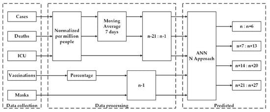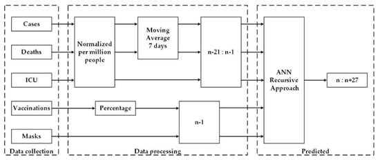 The experimented models used to predict the number of new daily cases of infection, deaths, and ICU patients were based on two approaches. The recursive approach made the prediction for the next day in a recursive way until 28 days ahead. The N approach made the prediction for one day of the next four weeks and recursively determined the other 6 days of each week. One ANN was used for each parameter—i.e., cases, deaths, and ICU patients—due to the delay of these time series, succeeding the sequence of cases followed by ICU patients and later deaths. The ANN has the previous 21 day’s numbers of cases, deaths, and ICU, plus the wearing of masks and the percentage of population with one dose of a vaccine at least, and the country identification, in its input. The ANN models made predictions for the next day until 28 days ahead.
